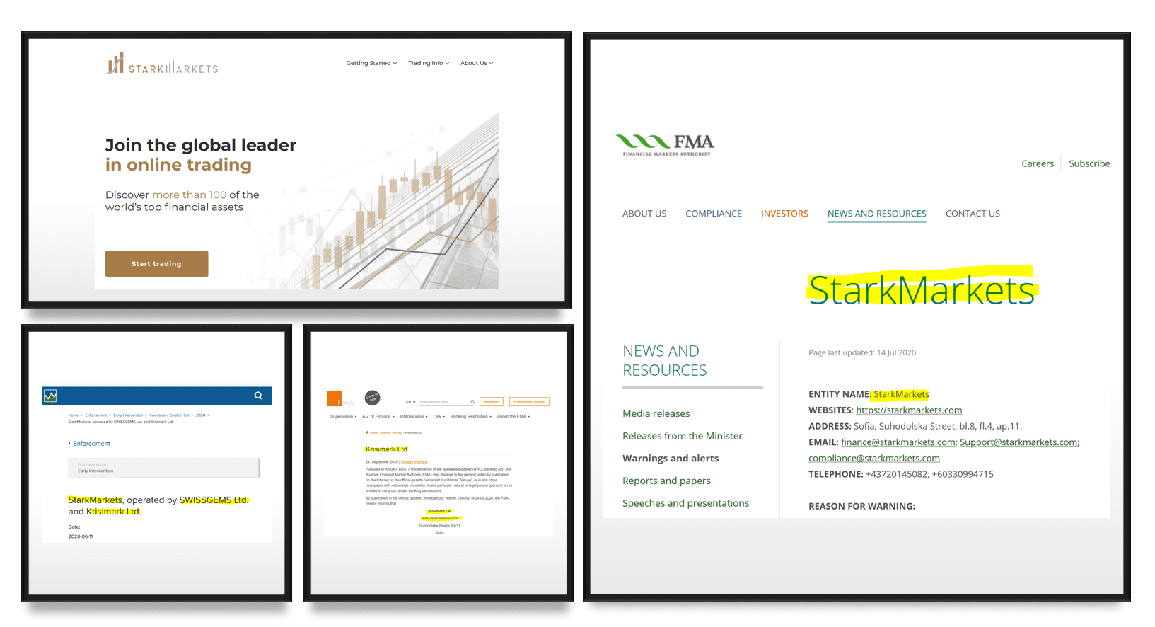 The Austrian Financial Market Authority FMA has issued an investor warning against the scam broker StarkMarkets (www.starkmarkets.com) which is allegedly operated by Krisimark Ltd and SWISSGEM Ltd in Sofia, Bulgaria. Already in June 2020, the Canadian British Colombia Securities Commission (BSC) issued an investor warning, and in July the New Zealand FMA (here). In May 2020, the Italian CONSOB blocked the website of broker scam MarketsCFD (www.marketscfd.net) of SWISSGEMS Ltd and Media Solutions Ltd.