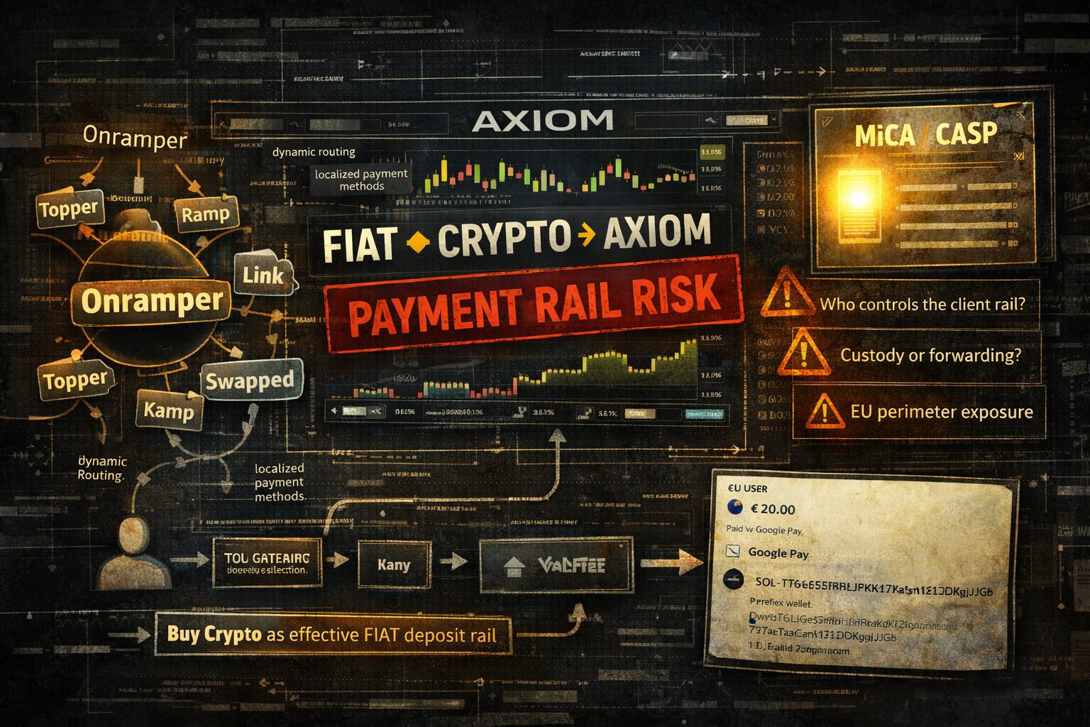 FinTelegram’s March 2026 review indicates that AXIOM’s “Buy Crypto” feature functions in substance as a fiat deposit rail into a DeFi-branded trading environment. While regulated or registered partners appear to execute the fiat-to-crypto leg, that does not remove AXIOM’s own MiCA perimeter risk.