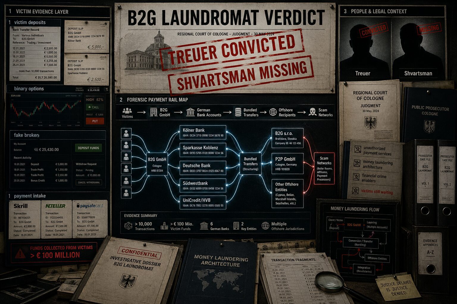 For years, FinTelegram warned that B2G was a German laundromat for binary options criminals. The Cologne judgment now confirms the illegal payment-services skeleton of that story. But the flesh and blood of the case — the laundering architecture, the scam brands, the offshore recipients, the role of banks, the regulatory delays, and the missing Shvartsman — remains only partly addressed.