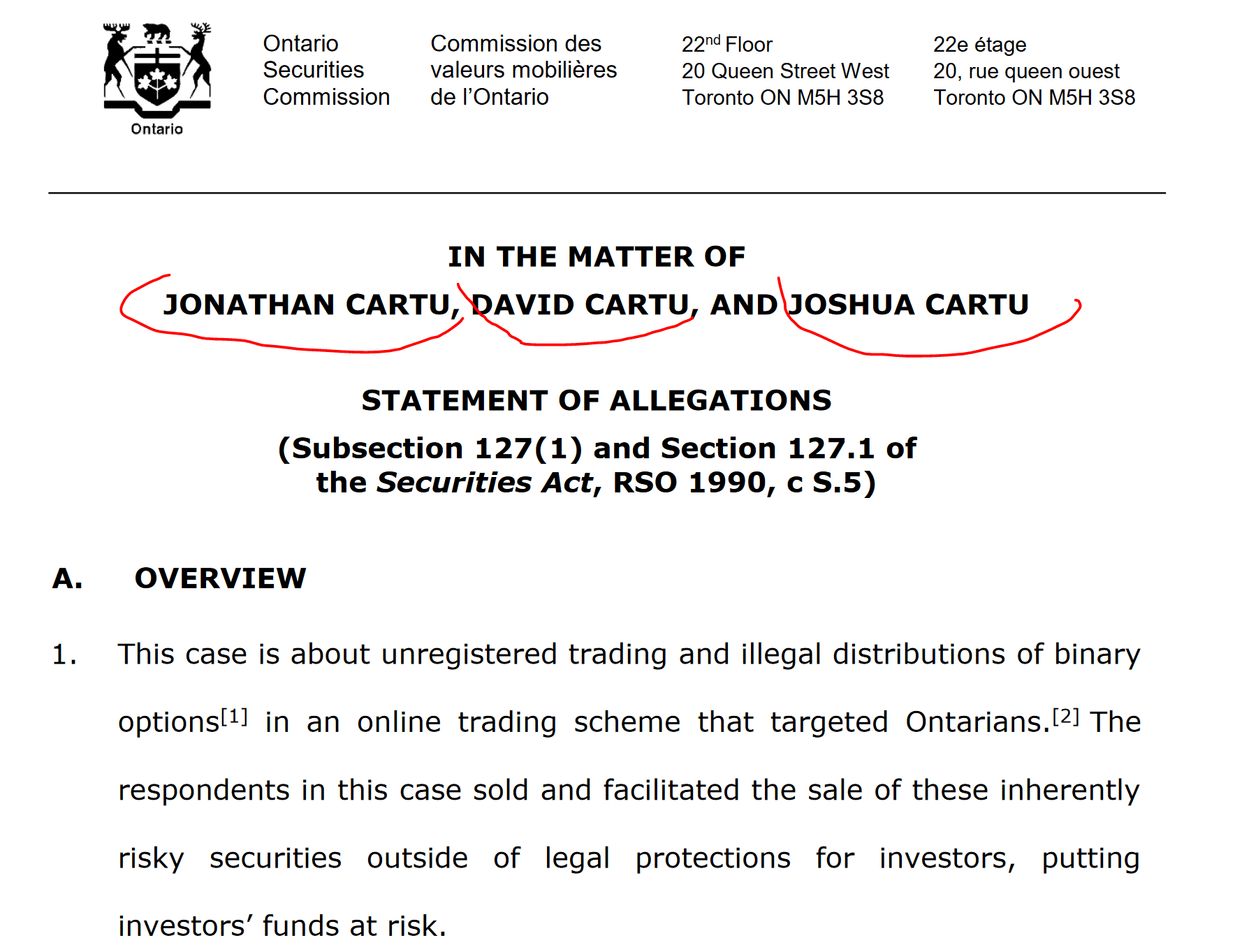 The Canadian regulator Ontario Securities Commission (OSC) has filed civil charges against the three Canadian-Israeli brothers David Cartu, Jonathan Cartu, and Joshua Cartu for illegally soliciting Canadians to trade binary options, defrauding Ontario residents out of $1.4 million, part of a $233 million global scheme. According to the report, the Cartu brothers immigrated to Israel from Ontario in the last decade. They mingled with Israeli elites and are living “flashy lifestyles” in swanky homes, dating models, and racing sports cars.
