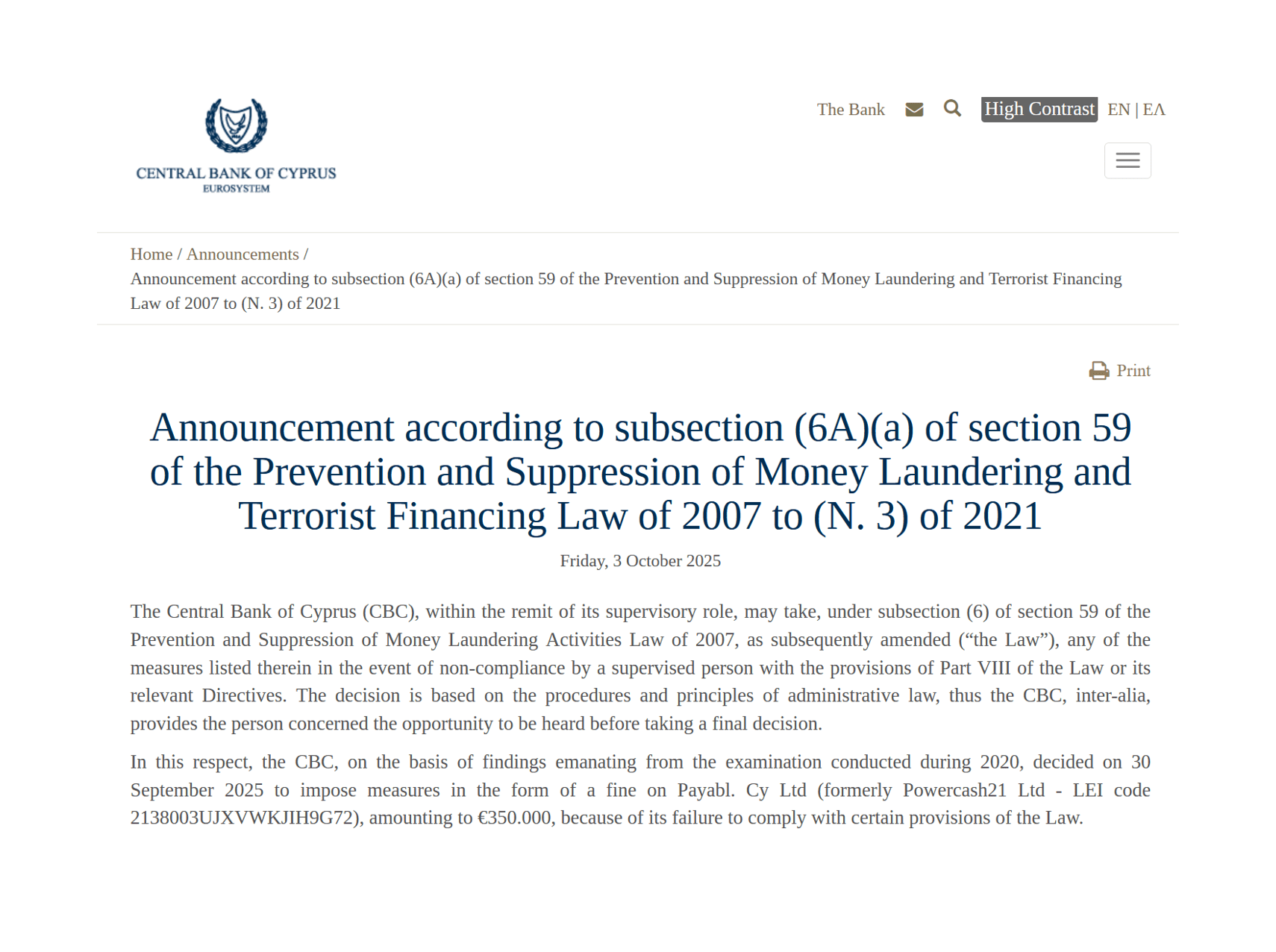 - On 30 September 2025, the CBC decided to impose an administrative fine on Payabl.Cy Ltd (formerly Powercash21 Ltd; LEI: 2138003UJXVWKJIH9G72).