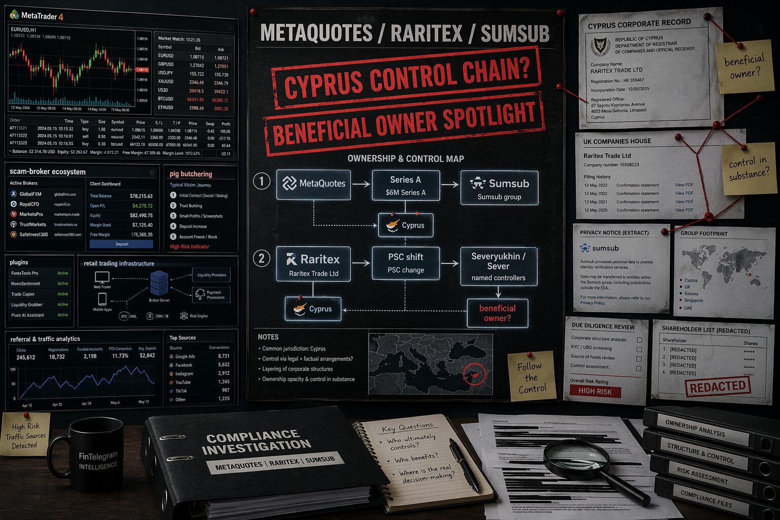The real issue here is not where these individuals were born. The real issue is that critical KYC-verification infrastructure and fraud-exposed trading infrastructure may sit inside the same partly opaque Cyprus-routed control environment. FinTelegramโs own archive has long treated MetaTrader as infrastructure heavily exposed to scam-broker abuse, while MetaQuotesโ public 2020 announcement confirms a direct funding link into Sumsub, a major verification provider.