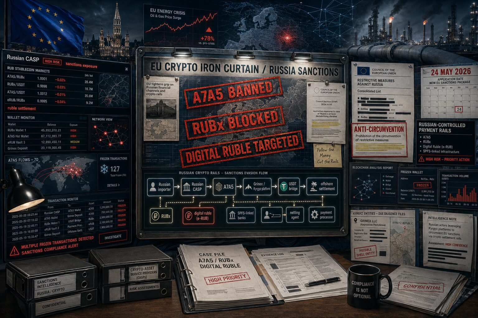 For EU CASPs, banks, EMIs, PSPs, stablecoin issuers and exchanges, the safest rule is simple: no Russian crypto rails, no ruble-stablecoin settlement, no Russian CASP connectivity, no A7A5/RUBx/digital-ruble exposure.