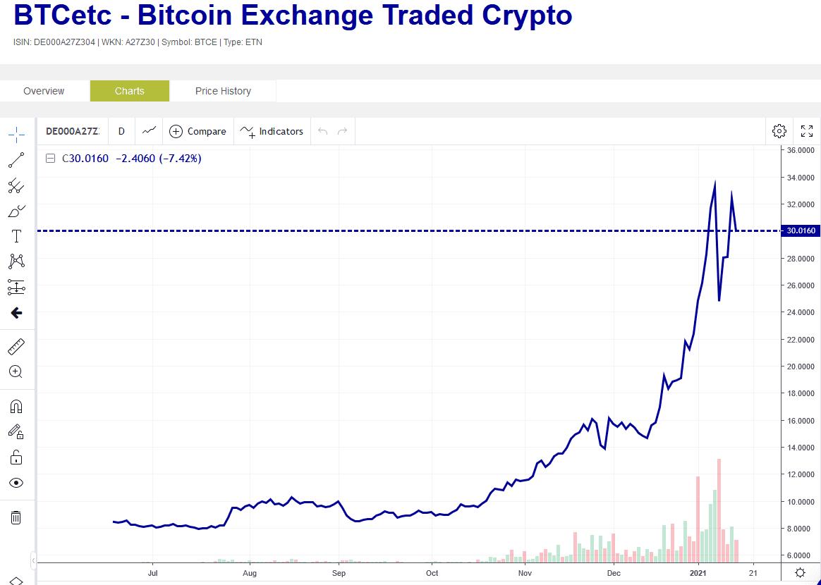 More and more traditional investors, and especially institutional investors, want to diversify into crypto assets without getting involved in crypto exchanges or OTC themselves. They invest in exchange-traded securities that have a direct crypto connection. In the U.S., the market leader is Grayscale Investments with several crypto-related products, and in Europe, Germany’s ETC Group is one of the market leaders. Trading in crypto-related products exploded in early 2021.