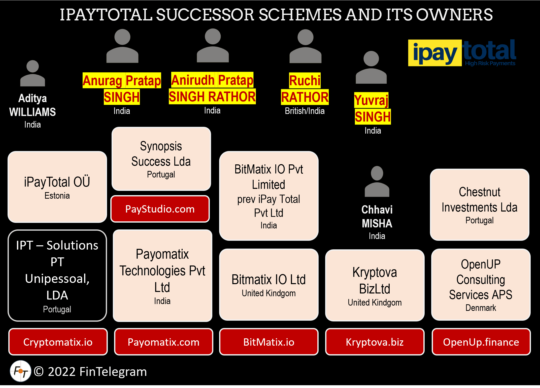 In Nov 2020, a UK court ordered iPayTotal Ltd to go into insolvency and liquidation. Many millions disappeared in the collapse of the British-Indian high-risk payment scheme. The beneficial owners were Ruchi Rathor, Anirudh Pratap Singh Rathor, and Anurag Pratap Singh. They operate several successor schemes through legal entities in India and Europe. Ruchi Rathors future son-in-law, Yuvraj Singh, is the mastermind behind OpenUp, Kryptova, and BitMatix. Merchants should avoid these payment schemes.