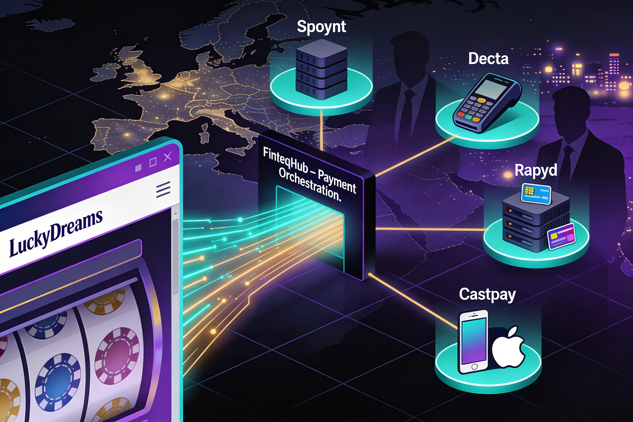 | 2. Orchestration layer | FinteqHub | Payment orchestration and routing engine; receives requests from casino, selects downstream PSP/acquirer based on rules, risk, and approval rates. | Positions itself as a “payment gateway & orchestration platform” with 50+ providers, smart routing, PCI DSS, focus on iGaming. |