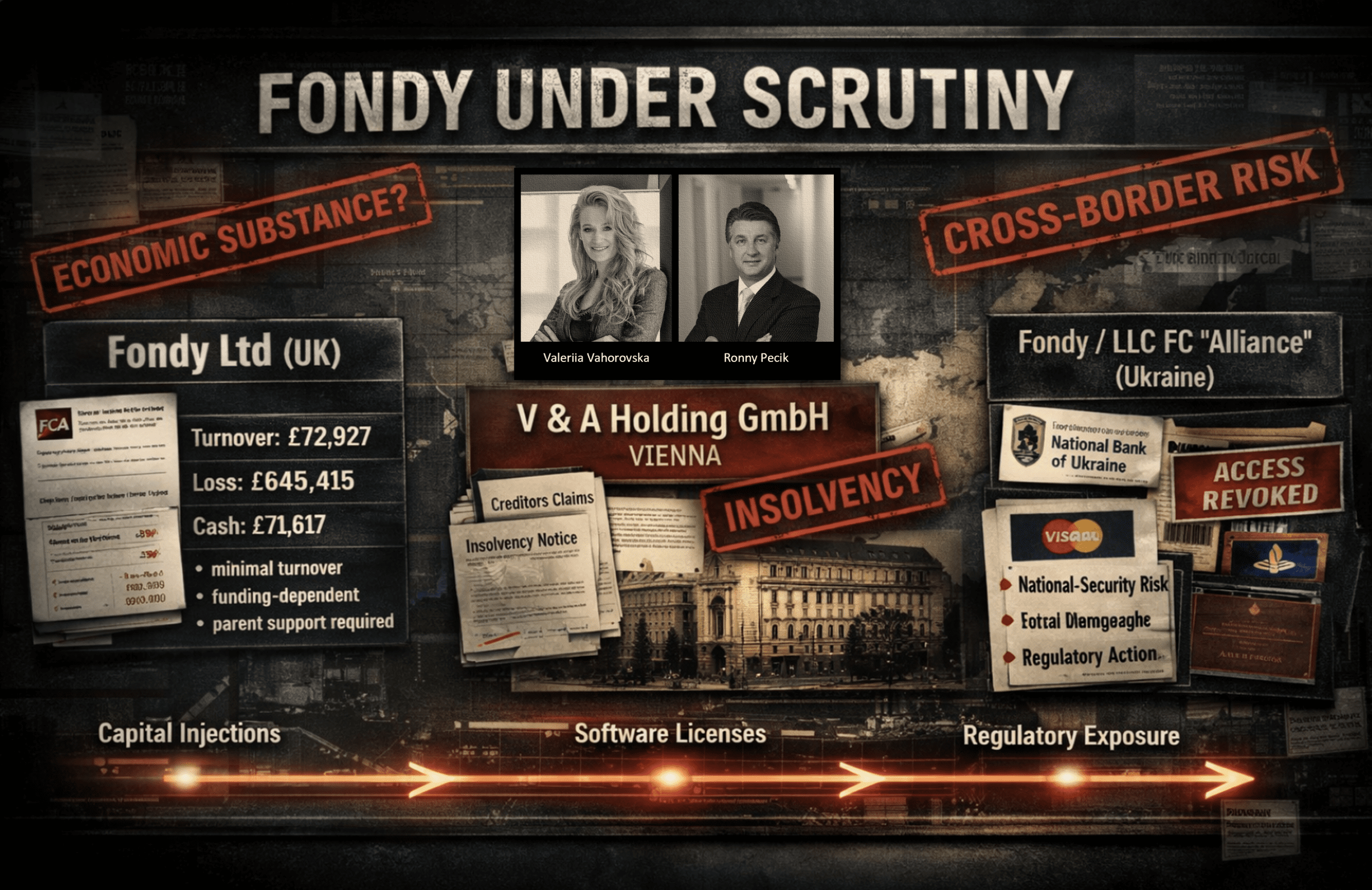 The Ukrainian fintech group Fondy raises a difficult compliance question. In the UK, Fondy Ltd is an FCA-authorised EMI with minimal reported turnover and repeated losses. In Austria, its ultimate parent V & A Holding GmbH entered insolvency in February 2026 and lists Valeriia Vahorovska and Ronny Pecik as shareholders. In Ukraine, the National Bank (NBU) cancelled the participation of LLC FC “Alliance”, operating under the Fondy brand, in Visa and Mastercard payment systems after receiving documented information indicating national-security risks. The public record does not prove a laundering scheme. It does, however, present a multi-jurisdictional structure that merits serious regulatory and forensic scrutiny.