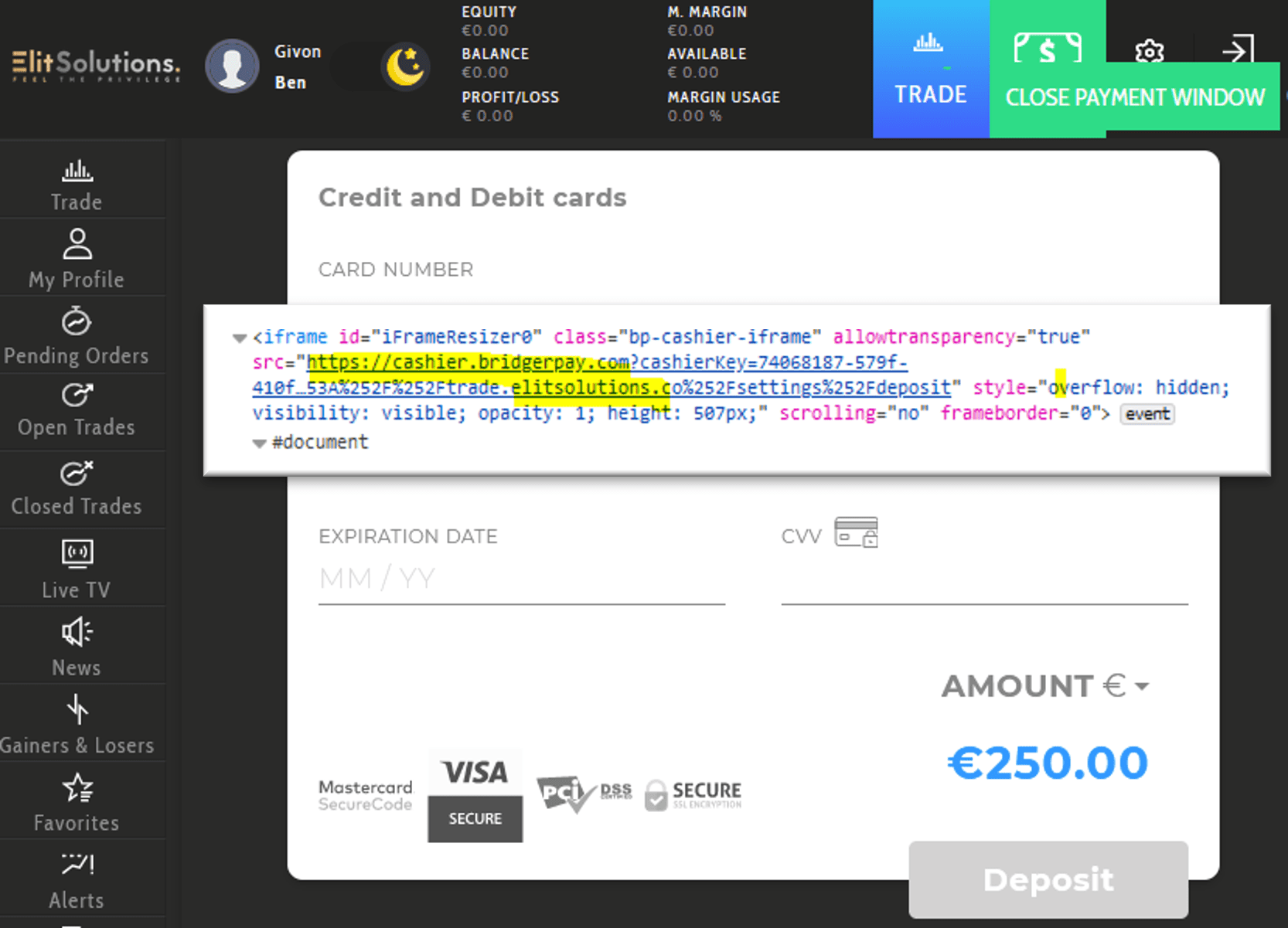 The supporting payment processors frequently change in scams. In today’s review of ElitOptions, we have again discovered the unregulated Israeli-Cypriot payment processor BridgerPay and, alternatively, the SandCheap cashier (https://sand.cheap) through which credit and debit card deposits of victims are processed. Stay far, far away from ElitSolutions.
