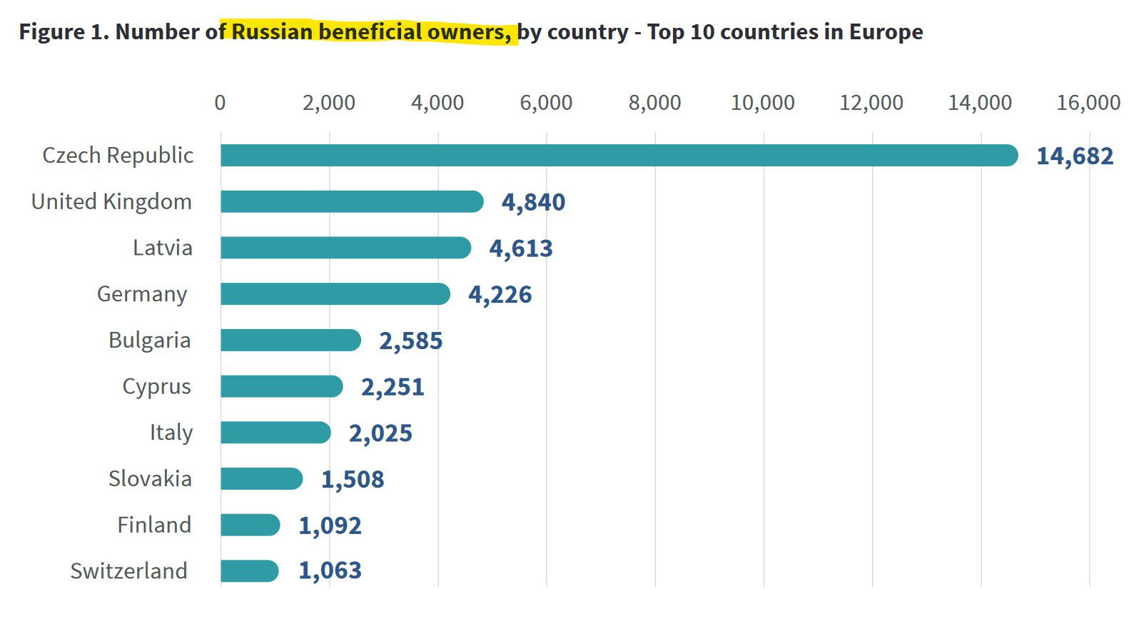 According to the Italian report Inside the matrioska, almost 44,000 Russian individuals are beneficial owners of companies registered in the European Union, in the United Kingdom, and in Switzerland. The highest number can be observed in the Czech Republic, followed by the United Kingdom, Latvia, Germany, Bulgaria, and Cyprus. More than 10 thousand Russians own firms registered in the area of Prague, and more than 3 thousand in the province of Riga, Latvia’s capital. In terms of corporate value owned by Russian oligarchs, Cyprus is the #1 in Europe!