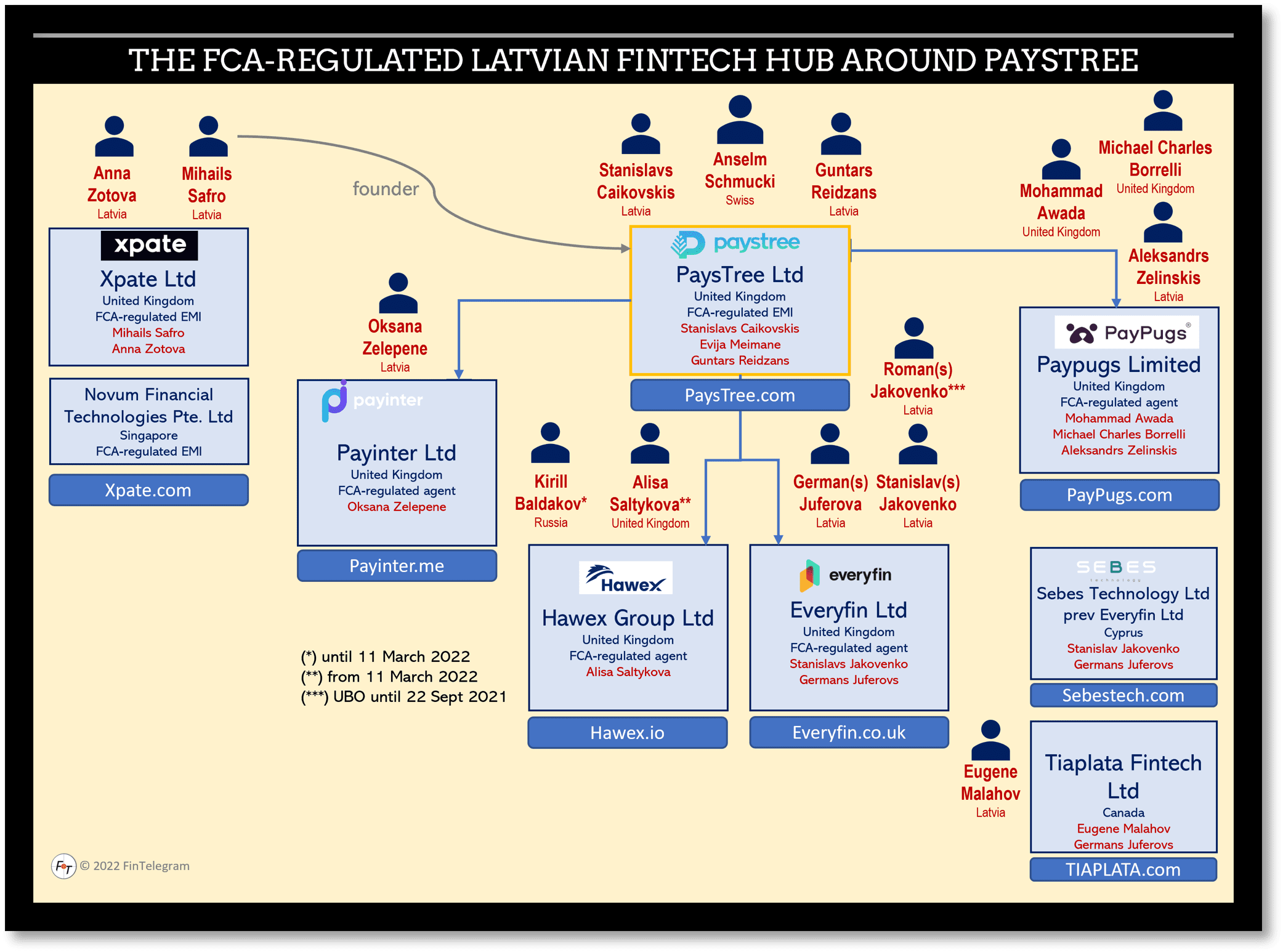 PaysTree‘s FCA-registered agents are also all controlled by Latvians: payinter (https://payinter.me), everyfin (https://everyfin.co.uk), Hawex (https://hawex.io), or PayPugs (https://paypugs.com). The acting individuals of everyfin also founded and run the SEBES Technology payment venture in Cyprus and TIAPLATA, a registered Money Business Service in Canada.