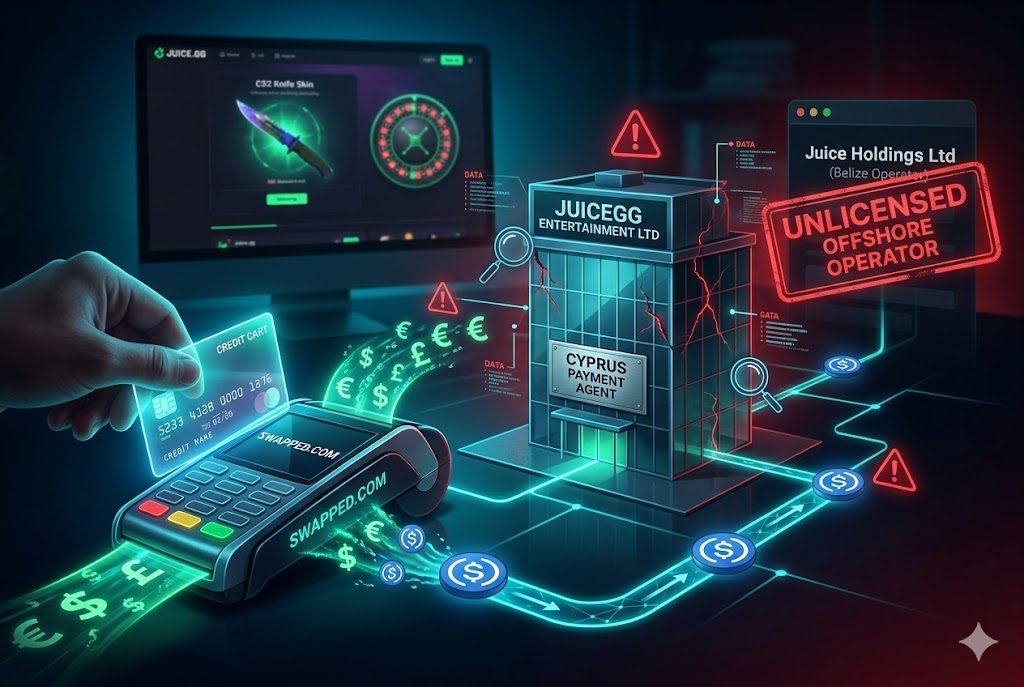 Juice.gg is an unlicensed CS2 skin-gambling platform owned and operated by Belize-registered Juice Holdings Ltd. Despite lacking any recognized iGaming license, the platform illegally targets global users, including minors. To circumvent strict European banking blocks and AML checks, the scheme utilizes a dual-entity structure, employing Cyprus-based JuiceGG Entertainment Ltd as its EU payment agent, while heavily relying on a deceptive third-party gift-card payment loop.