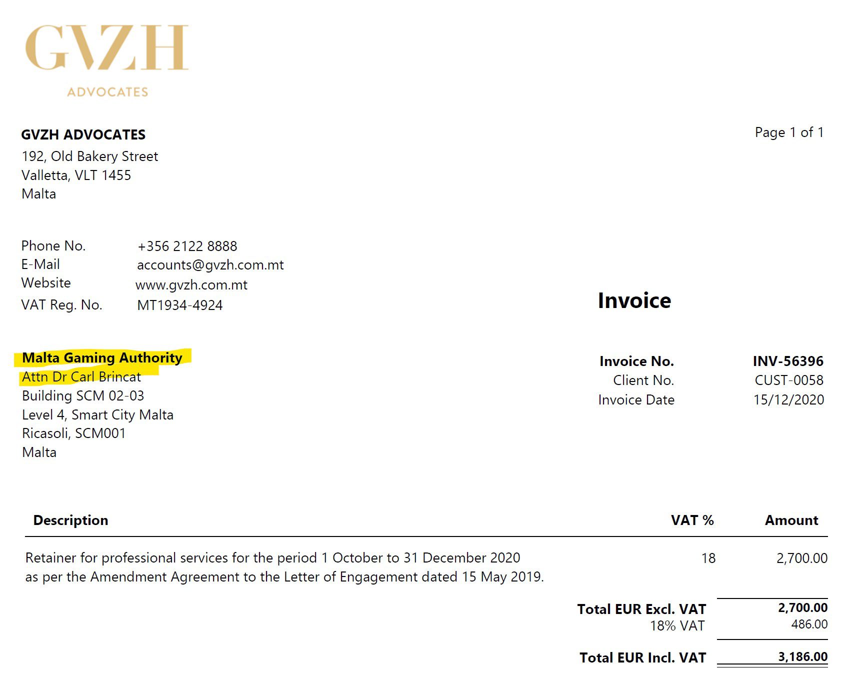 Fintelegram can reveal that the Malta Gaming Authority (MGA) has been using the services of outsourced lawyers rather than its in-house lawyers to defend itself against license holders and selected persons. One of the law firms that is raking in tens of thousands of euros is GVZH Advocates. It is not known how they were selected. Fintelegram is publishing proof that this law firm has been enjoying a hefty retainer for years. The published invoice is addressed to MGA CEO Carl Brincat.