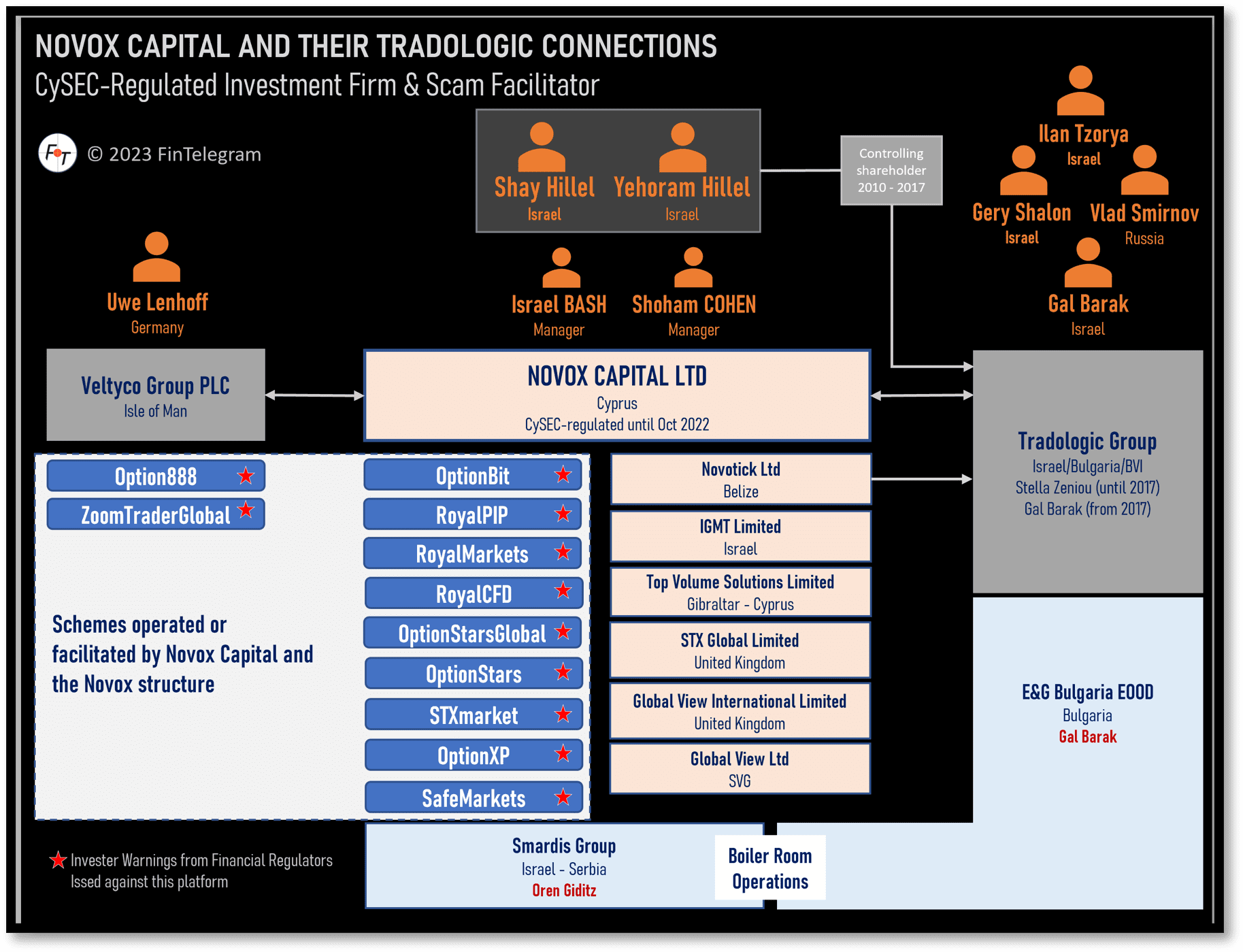Novox Capital, once a CySEC-regulated company, operated some “regulated” binary options brands. Additionally, Novox provided services to numerous scam schemes and offered them a regulatory umbrella: Option888 of Uwe Lenhoff, OptionStars of Gal Barak, and many others. The beneficial owners of the Novox Group were the cousins’ Shay Hillel and Yehoram Hillel. They were also the main shareholders of the broker software company Tradologic. Novox and the Hillels are also at the center of the various trials.
