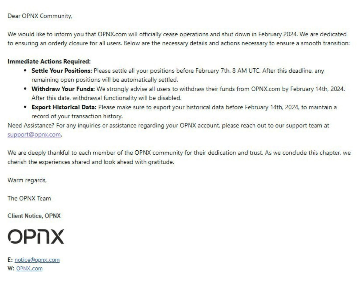 OPNX, a cryptocurrency bankruptcy claims platform initiated by the founders of the now-defunct hedge fund Three Arrows Capital (3AC), has announced it will terminate all operations and close down by February 14th. In a communication to its users, the platform has urgently advised them to settle their positions by February 7th and ensure all funds are withdrawn before the February 14th deadline, after which the withdrawal functionalities will be permanently disabled.