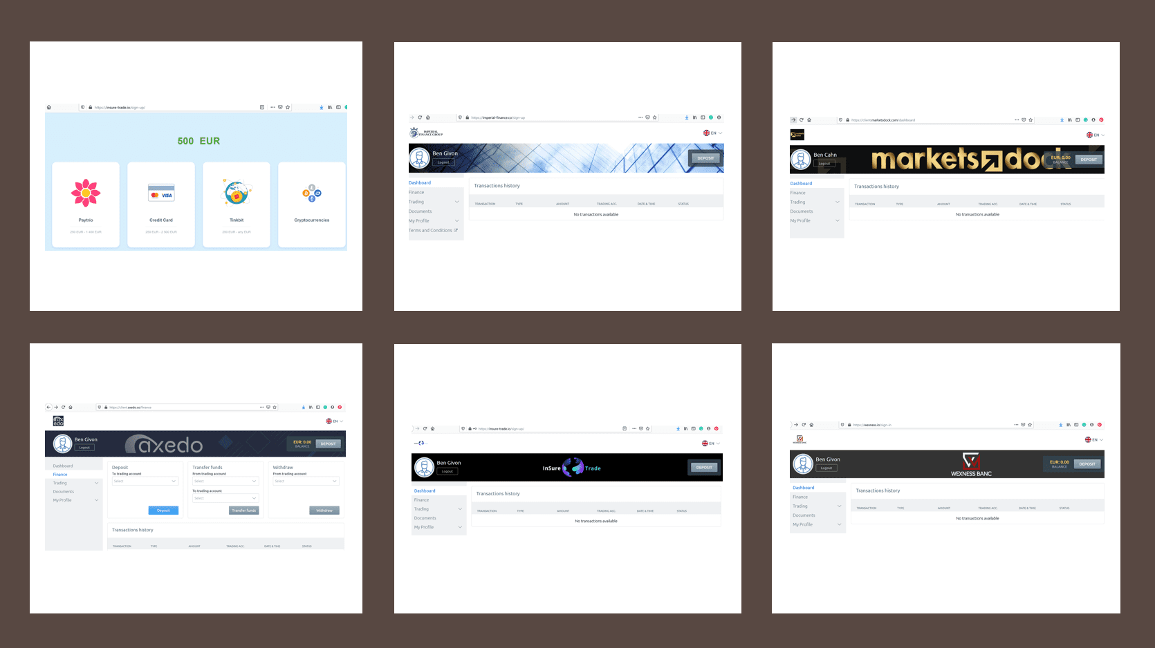 The five brokers scams Axedo, Wexness Banc, Insure Trade, MarketsDock, and Imperial Finance work with the Russian payment processor Piastrix (www.piastrix.com) which allows for a wide range of payment options. Insure Trade has also integrated the Estonian payment processor Tinkbit where the customer victims of the scams can purchase cryptocurrencies with credit and debit cards.