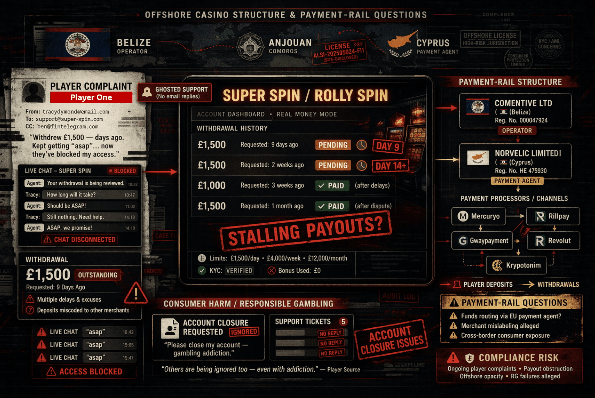 FinTelegram has reviewed an email chain from a player alleging delayed withdrawals, repeated stalling, blocked live-chat access, and unresolved account-closure issues involving Super Spin and sister brand Rolly Spin. The complaint identifies Belize-registered Comentive Ltd as operator and points to a Cyprus payment-agent structure disclosed on the casino side, raising wider compliance questions around offshore gambling operations, consumer harm, and payment facilitation.