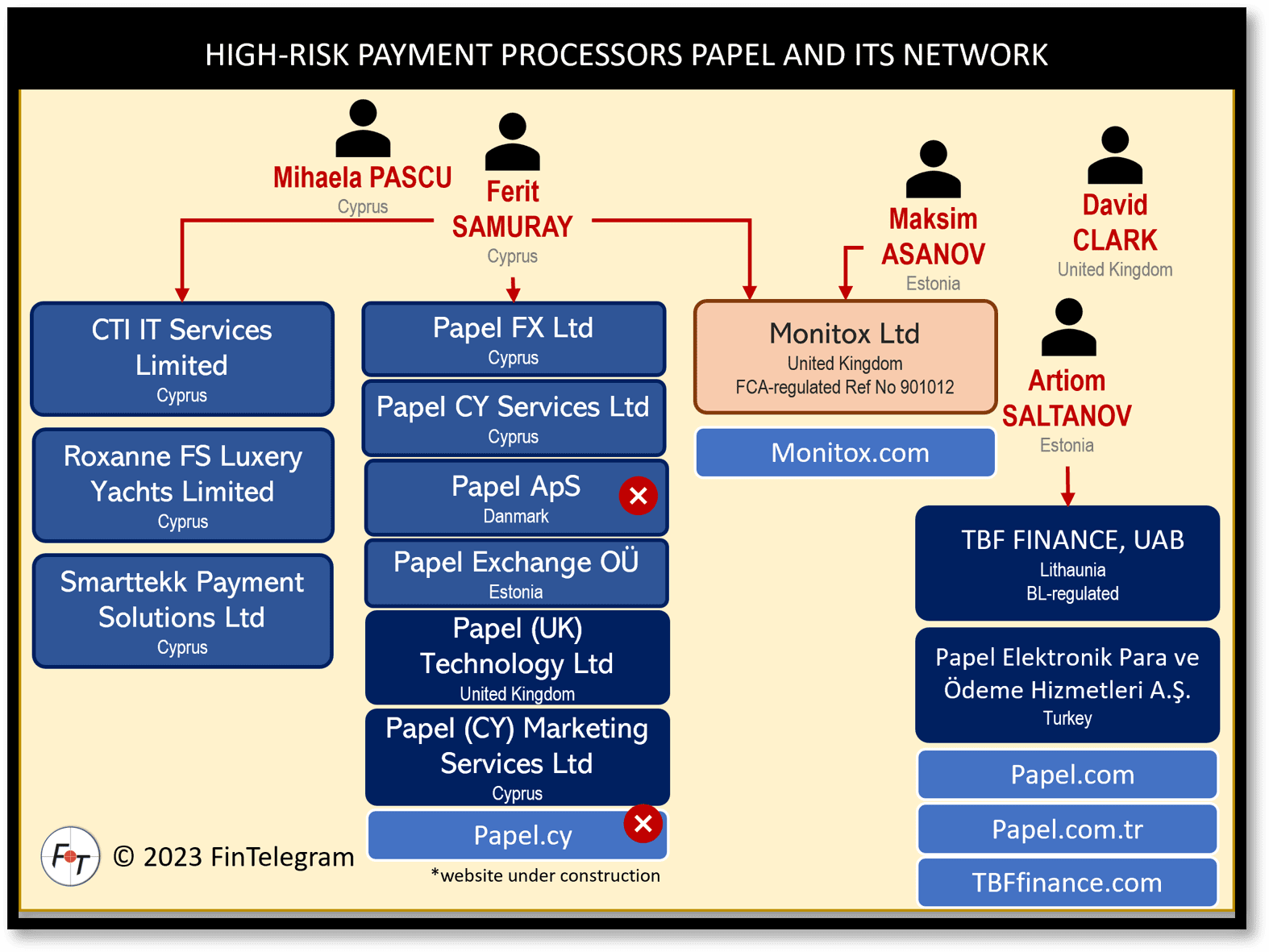 We have discovered Ferit Samuray as a director in the high-risk payment processor Monitox Ltd, an e-Money Institution regulated with reference number 901012 by the FCA. Monitox is controlled by Estonian Maksim Asanov. Whistleblower informed us that Monitox is still connected to the “new” Papel Group. We can neither confirm nor deny this.