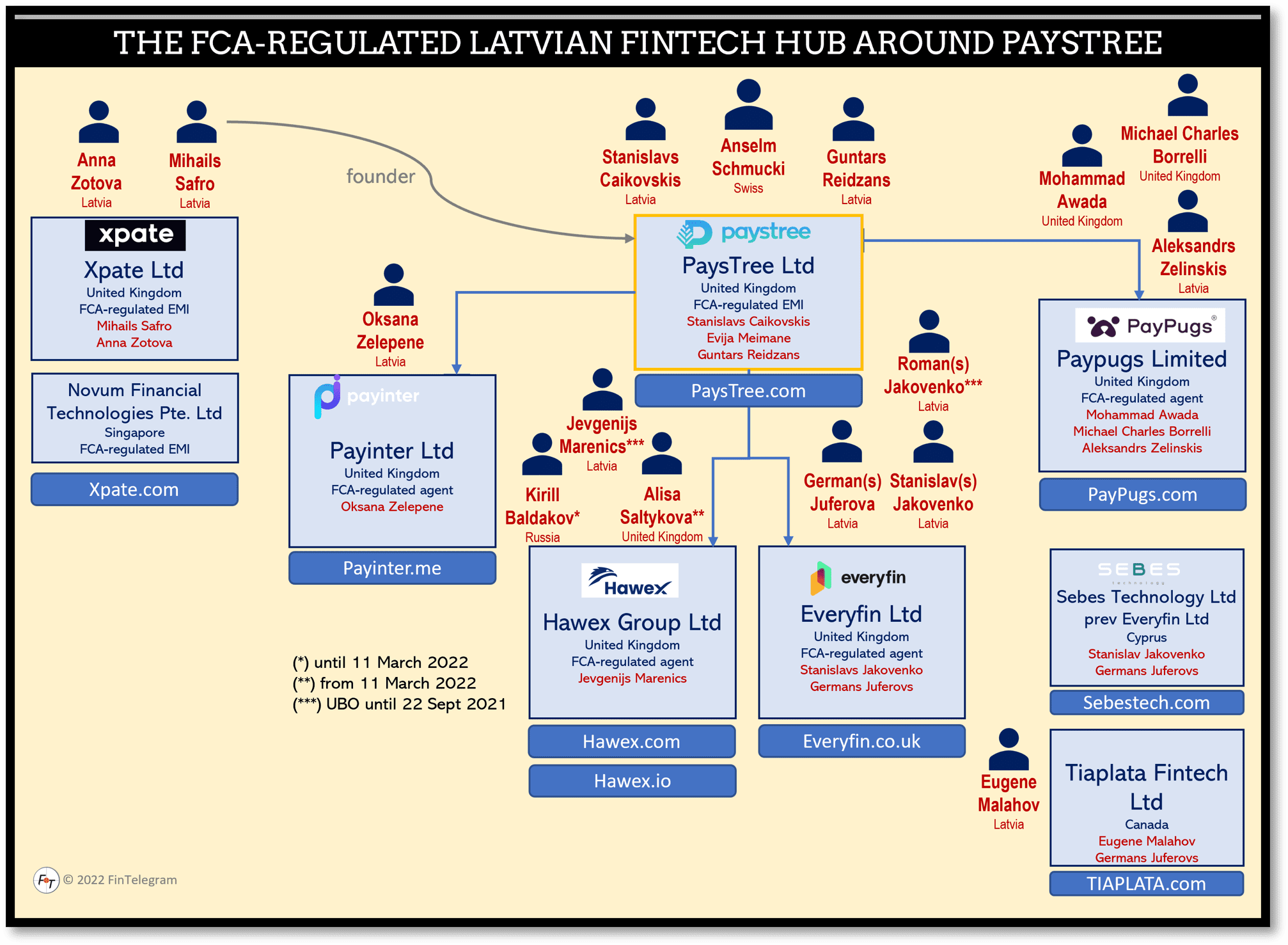 PaysTree‘s FCA-registered agents are also all controlled by Latvians: payinter (https://payinter.me), everyfin (https://everyfin.co.uk), Hawex (https://hawex.io), or PayPugs (https://paypugs.com). The acting individuals of everyfin also founded and run the SEBES Technology payment venture in Cyprus and TIAPLATA, a registered Money Business Service in Canada.