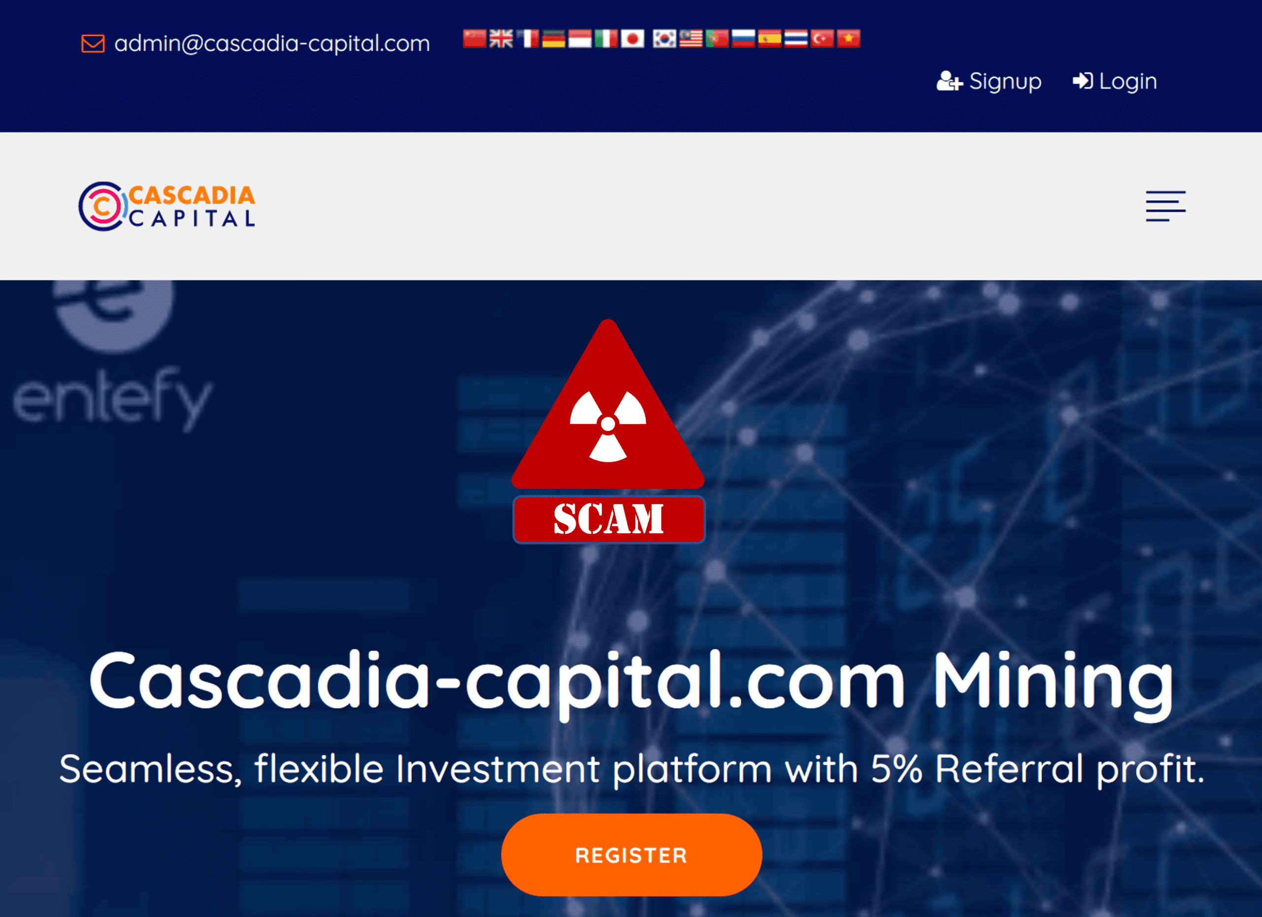 Cascadia-Capital (www.cascadia-capital.com) claims to be an investment platform that would bring high returns to investors through a trade automation system. They offer several investment plans that are supposed to bring up to 35% profit in just 96 hours. These promises are complete bullshit. Victims can currently only deposit via Bitcoins (BTC). The website claims that the operator would be a U.S. company in California. Currently, the scammers promote their fraud massively advertised via Telegram. Please do not fall for it.