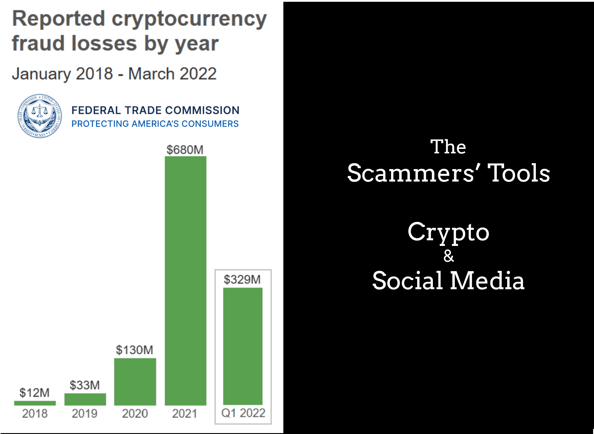 The reported losses in 2021 were nearly sixty times what they were in 2018. Crypto has several features that are attractive to scammers. There’s no bank or other centralized authority to flag suspicious transactions and attempt to stop fraud before it happens. Crypto transfers can’t be reversed – once the money’s gone, there’s no getting it back. And most people are still unfamiliar with how crypto works.
