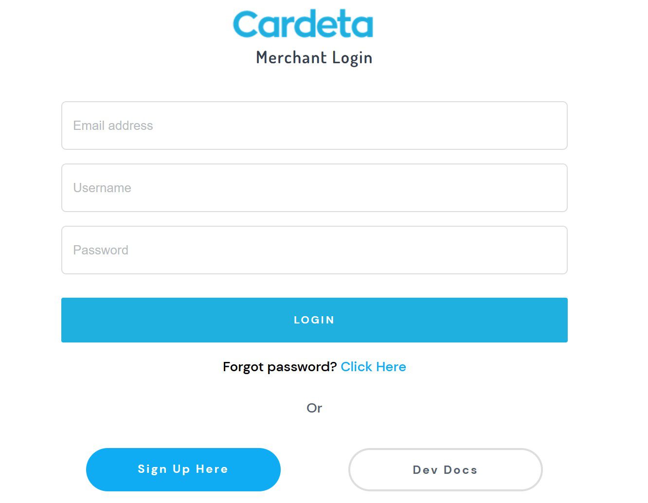The Cardeta website (https://cardeta.com) does not work; only the login page for the Merchant Control Panel is online with the domain https://merchants.cardeta.com and the Development Center with the domain https://devcenter.cardeta.com.